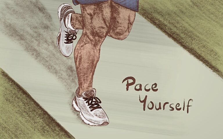 Pace oneself to avoid doing something too quickly or doing too much at one time, so that you have enough energy left to complete an activity 1 to do something at a speed that is steady and that